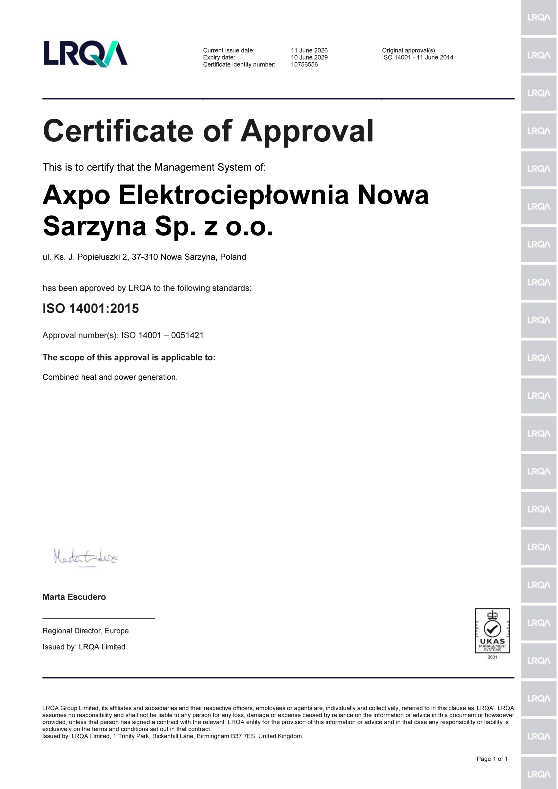 The environmental protection activities are for Axpo Elektrociepłownia Nowa Sarzyna sp. z o.o. one of the priorities of the management. To this end the management decision was made to implement an Environmental Policy adhering to the regulations set out in ISO 14001. This is an international set of standards which governs environmental protection for companies within the sector. The decision to comply with ISO 14001 demonstrates the company’s concern to minimize their footprint on the environment.